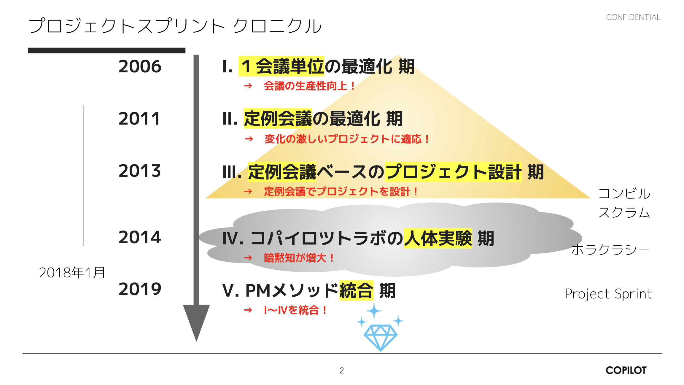 プロジェクトのあり方は変化し続けています。これを追いかけるためには「いま見えないものを見ようとする活動」が不可欠です。COPILOT Explorer は、コパイロツトが自らの視野の外と向き合うことを目的に、メンバーが開拓した新たな視点や経験(研究成果・事例や、新領域における経験)を拾い上げて結晶化 (Zip) します。それらを現場活用のヒントとしてアーカイブし二次利用を可能にすることで、新たなプロジェクト推進に向けたリアリティを醸成します。